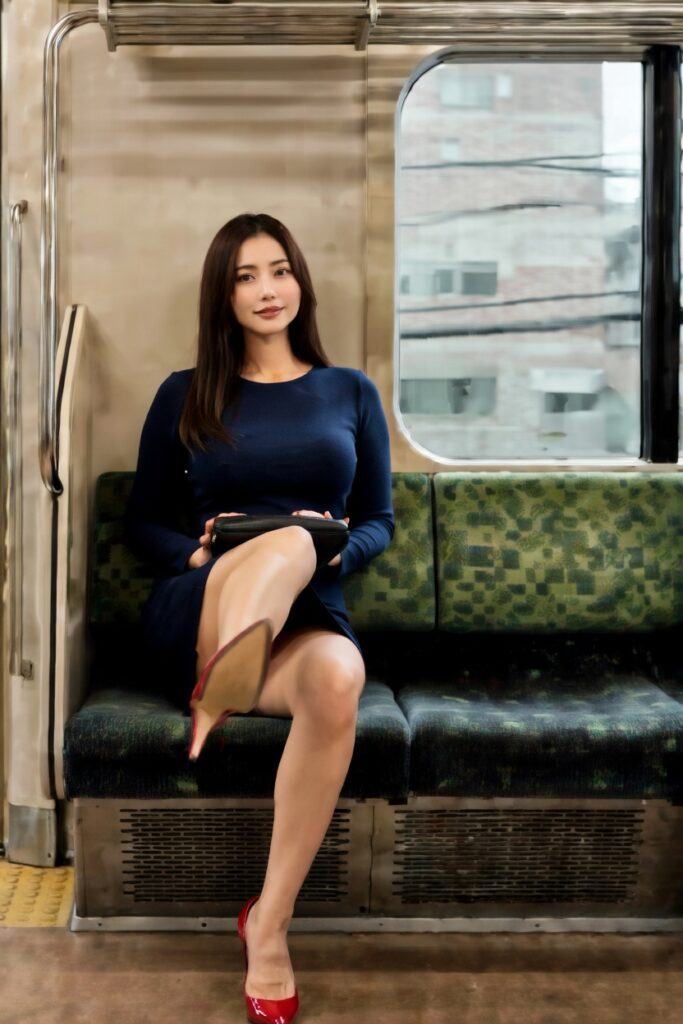 電車内で脚を組むタイトワンピ美女(赤ハイヒール)